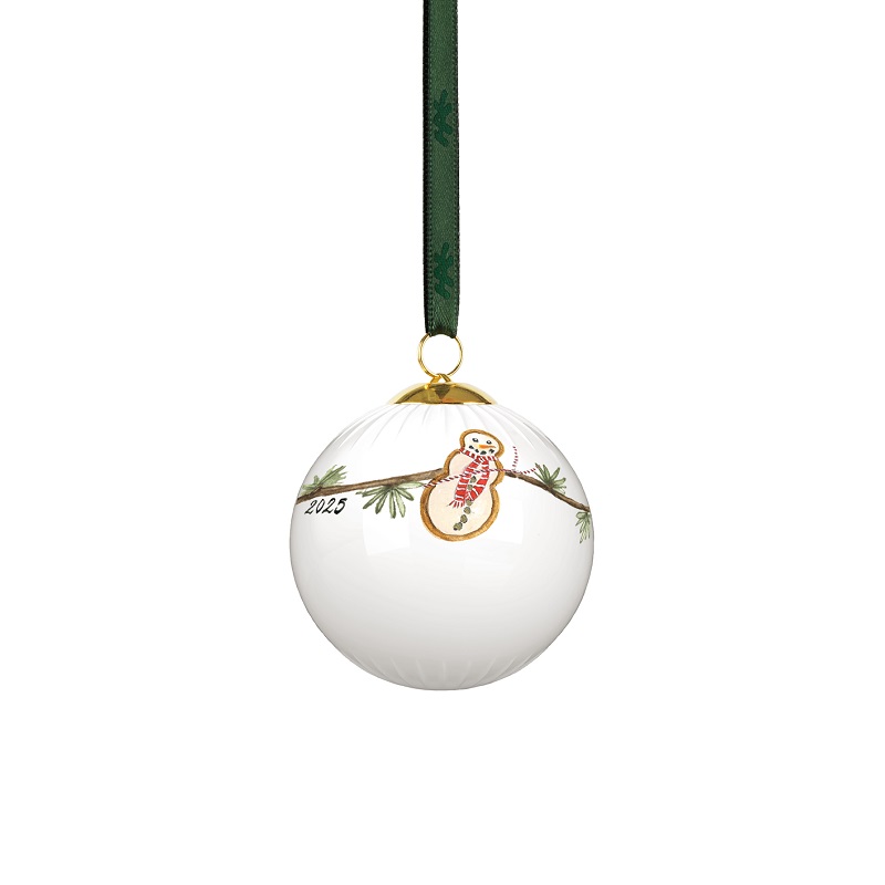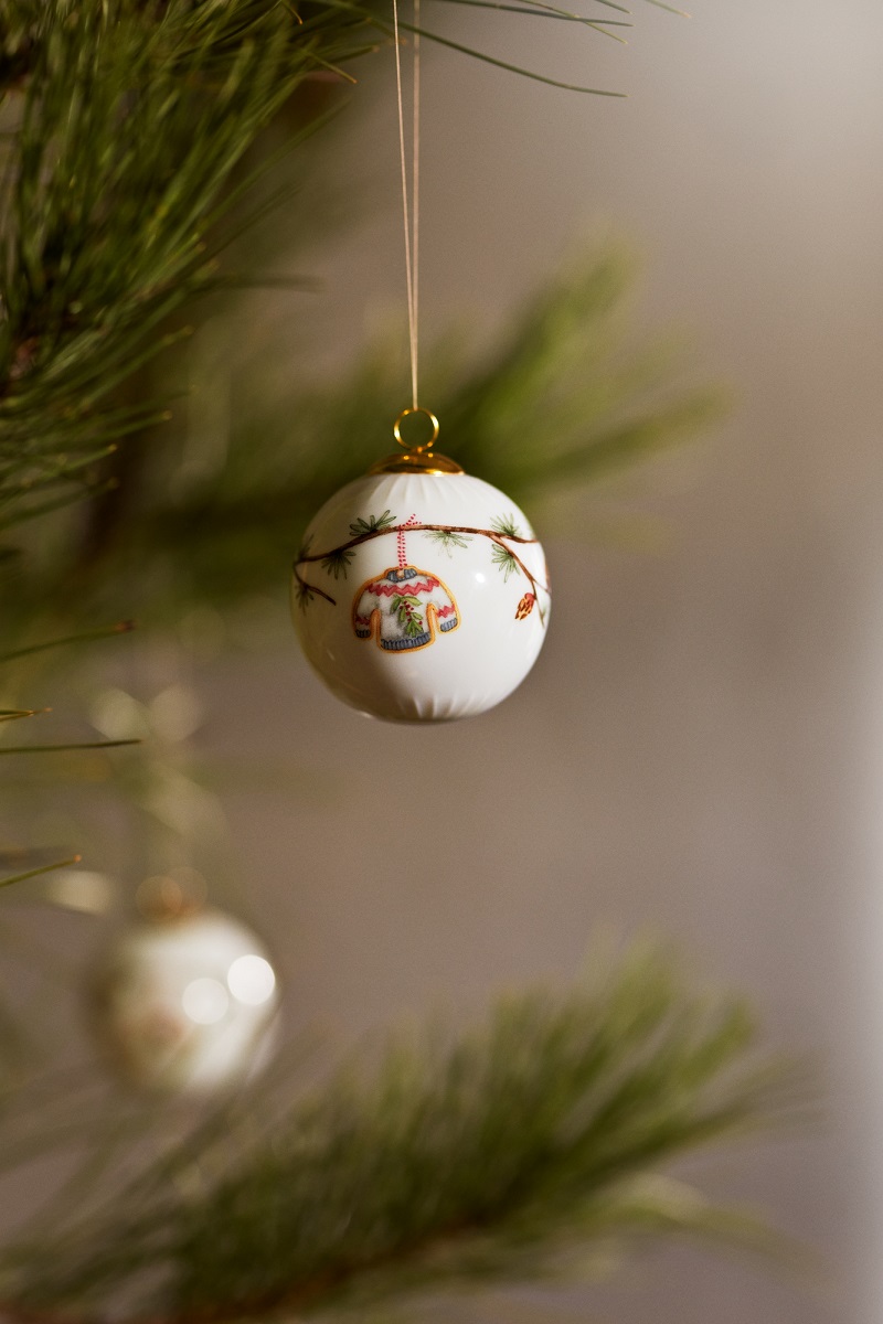 Die Kugel mit einem Durchmesser von 6 cm ist liebevoll mit einem Zweig der Zeder, Lärchenzapfen und charmanten Weihnachtsornamenten verziert: einer Orangenscheibe mit blauem Band, einem feinen kleinen Pilz sowie zwei hausgemachten Lebkuchenfiguren in Form eines Schneemanns und eines Weihnachtspullovers. Diese detailreichen Motive verkörpern Authentizität, Wärme und weihnachtliche Nostalgie – und machen jede Kugel zu einem einzigartigen Sammlerstück.